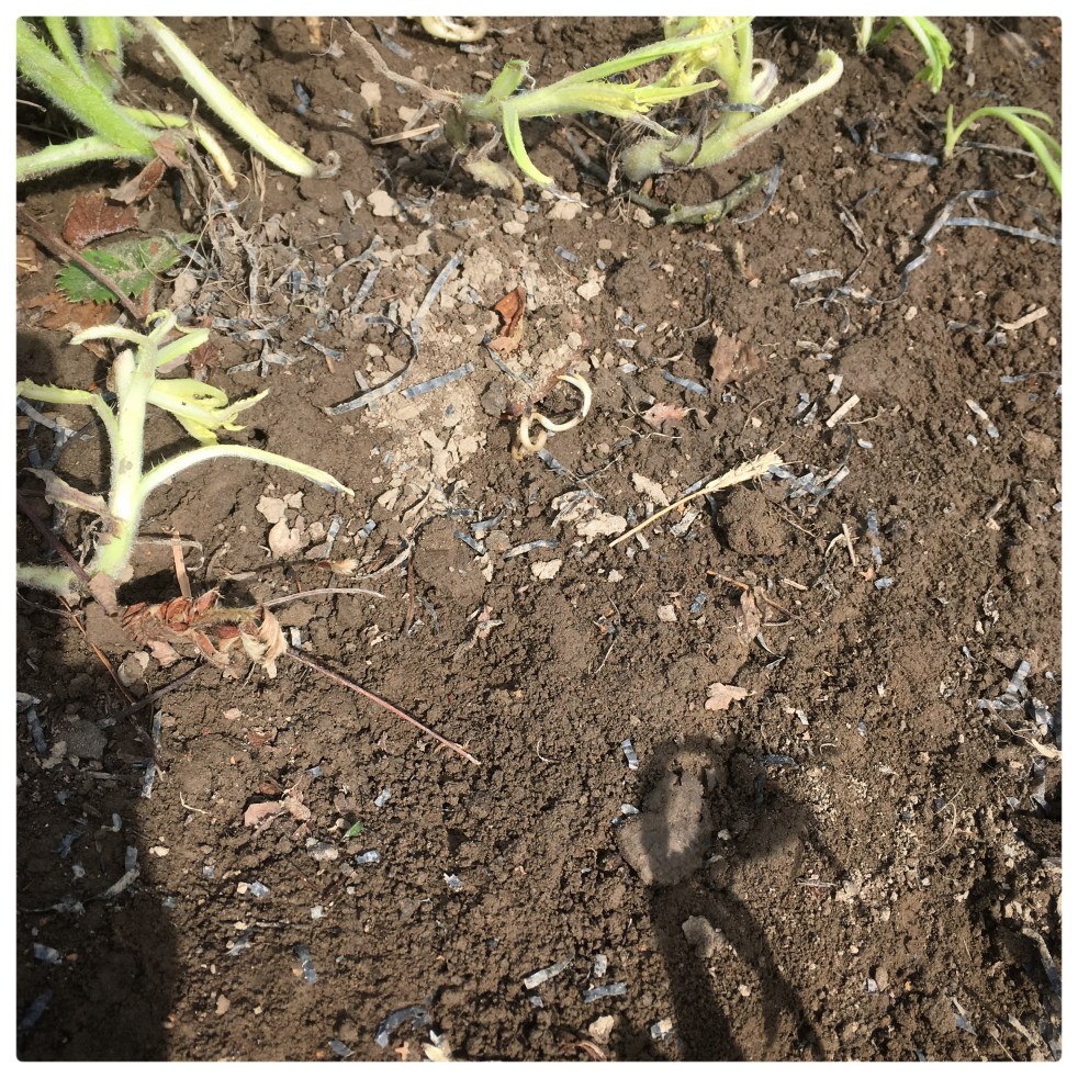 Tässä toisessa kuvassa näkyvät pienet muovinpalaset. Mansikkakankaasta lähtee myös hyvin pitkiä muovisäikeitä, joiden luulisi tarttuvan pikkunisäkkäiden jalkoihin. Palstalla halutaan viljellä luomusti, mutta surettaa maahan jäävä muovijäte.