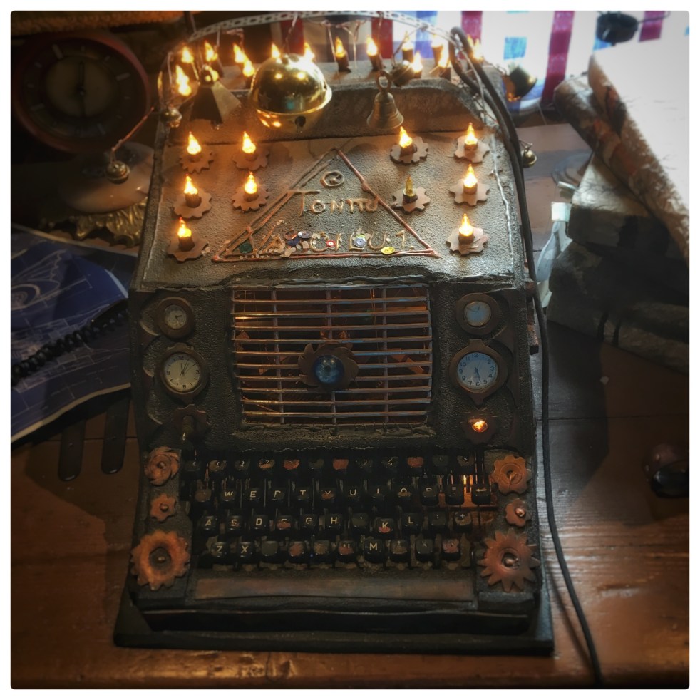 Tämä Joulupukin kirjoituskone on aivan ihastuttava hänen piilopirtissään Kenkäverossa. Hullunkurinen mekaaninen valaistu laite!