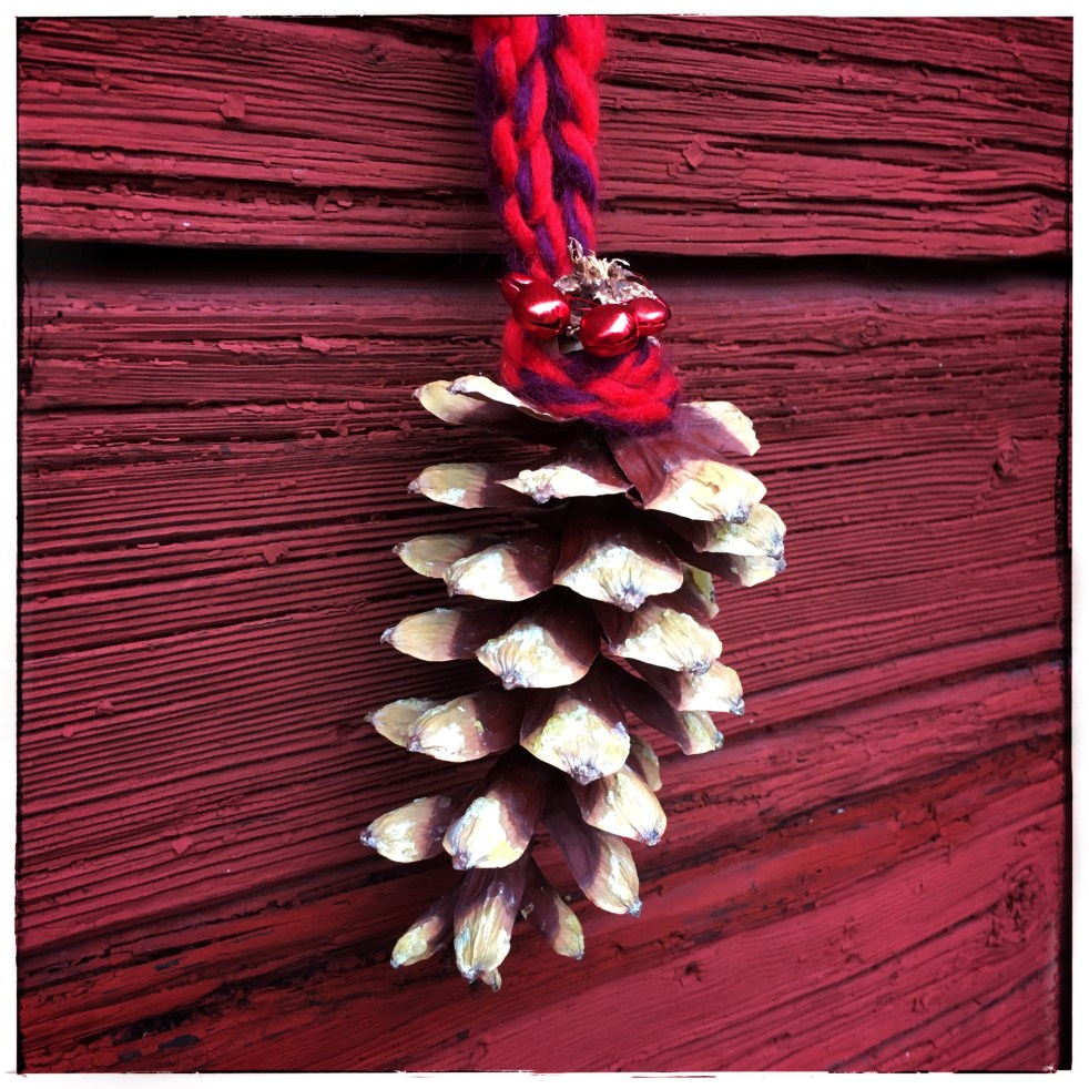 Tein pienen joulukoristeen hautuumaalta poimimastani jättikävystä. Orava oli nakertanut siihen valmiiksi hyvän kannan villalangan kiinnitykseen. Lisänä on vain pieniä, punaisia tiukuja. Tämän päivän joulukoristeissa on niin paljon muovia, etteivät ne ainakaan minua innosta.