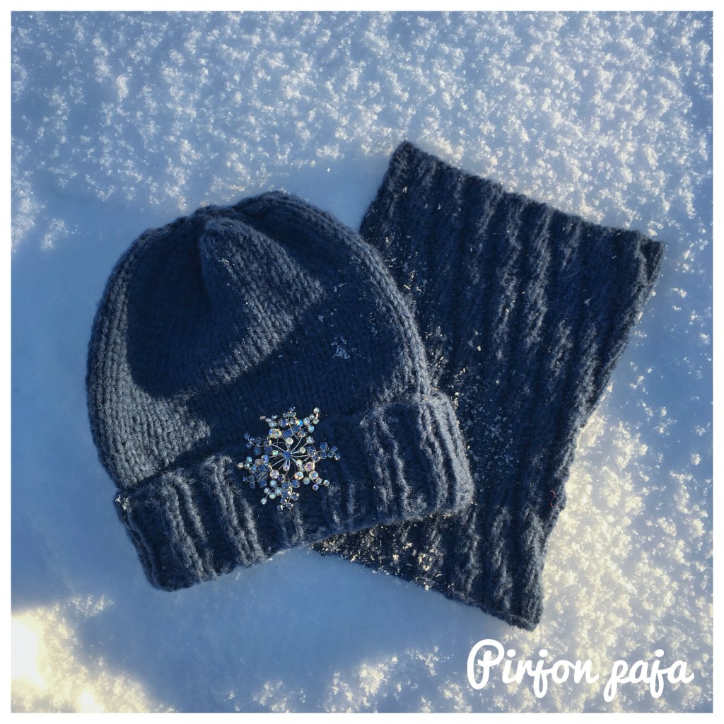 Koska lanka on varsin pehmeää, en viimeistellyt myssyä mitenkään. Lukuunottamatta tuota rohmua korua. En yleensä ole kiiltävän perään, mutta talvisin minusta tulee varsinainen pyryharakka☺️❄️.