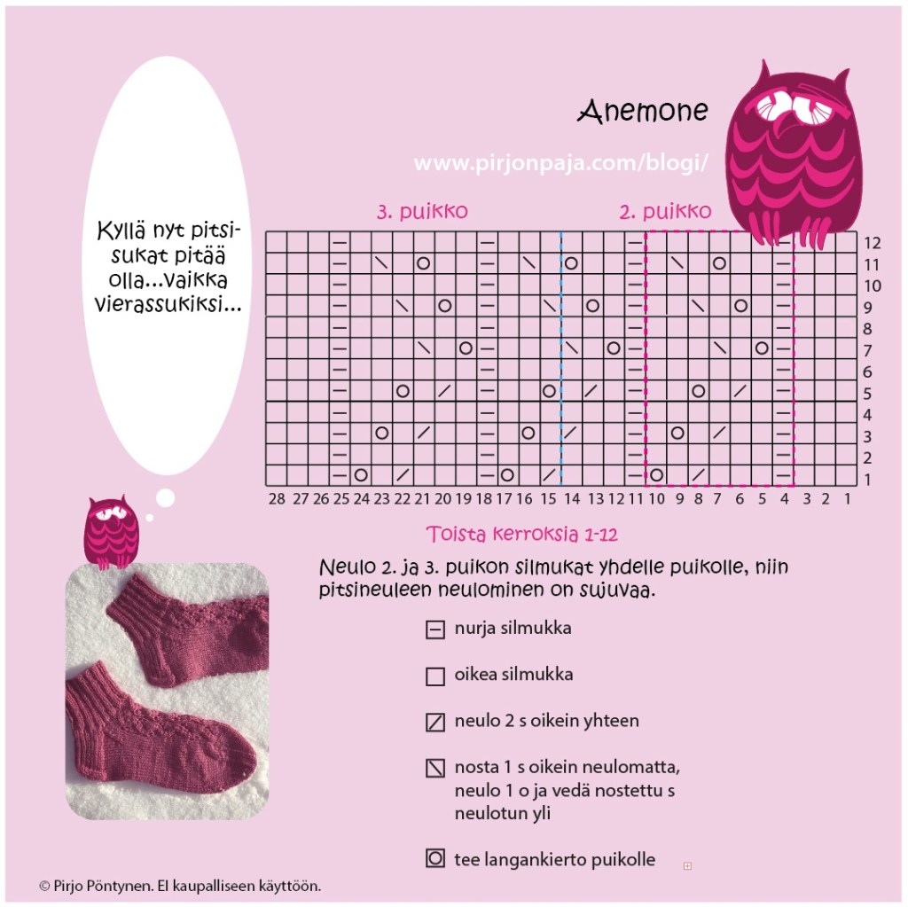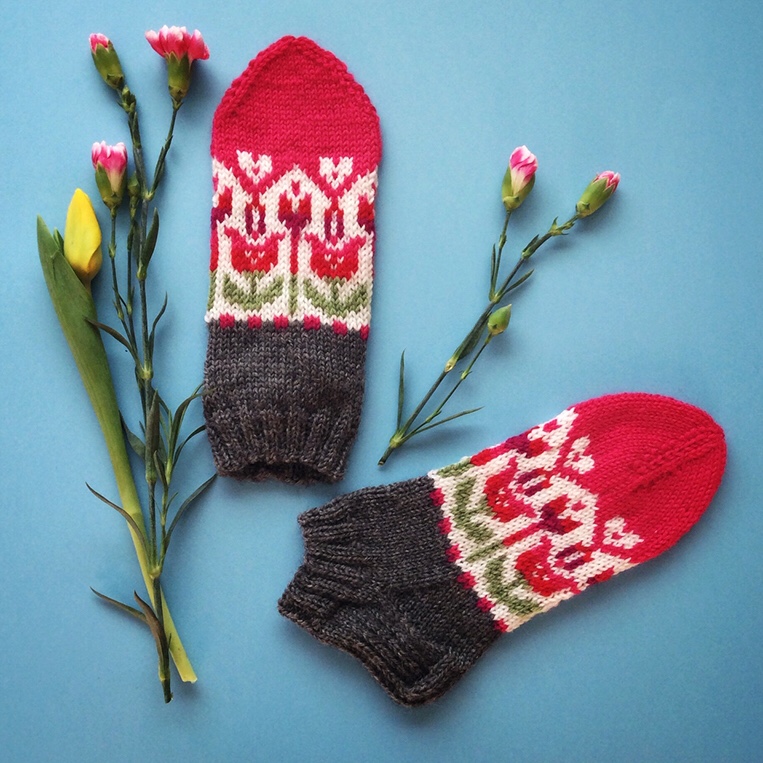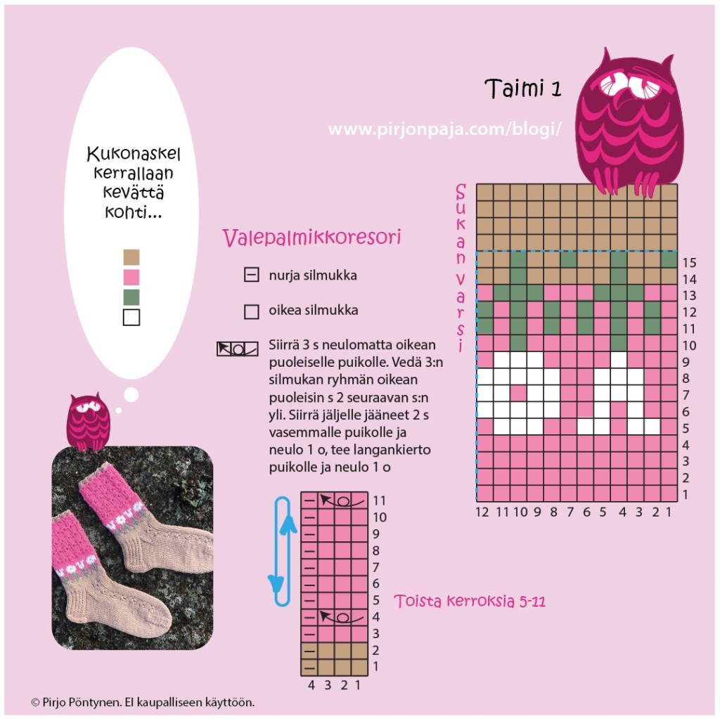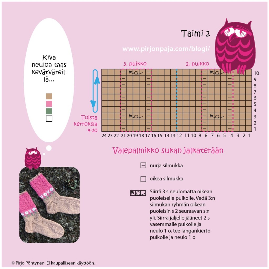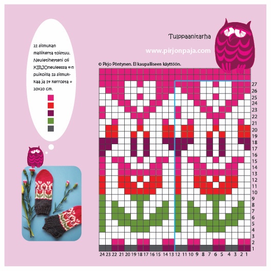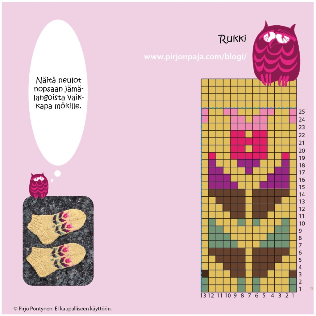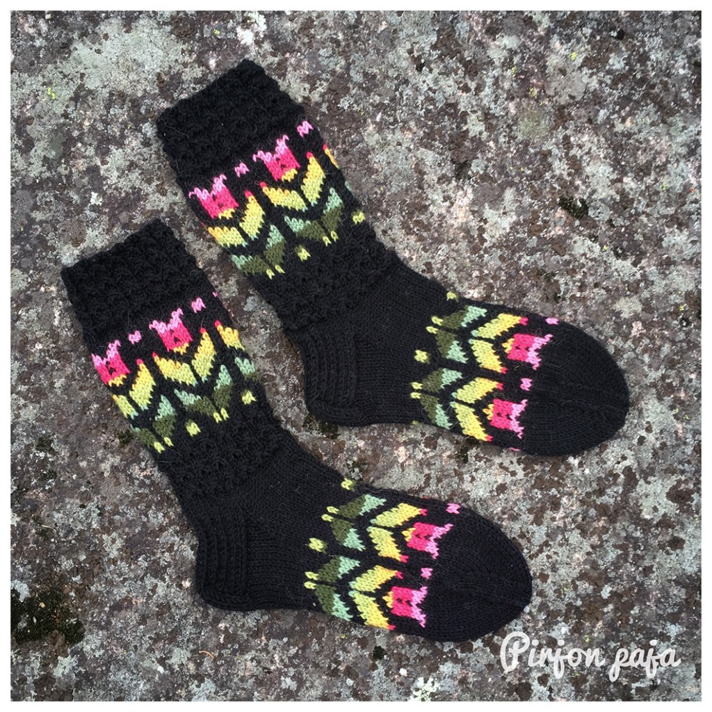 Neulo sitten 4 välikerrosta kokoon 38, (6 välikerrosta kokoon 39, 8 välikerrosta sileää kokoon 40), ja tämän jälkeen neulo jalkaterän tulppaanikuvio. Kuvion jälkeen neulo 7 välikerrosta sileää koossa 38 ( ja 39 ja 40), ja sitten aloita kärkikavennukset. Koon 38 pohjan kokonaispituudeksi tulee noin 24 cm.