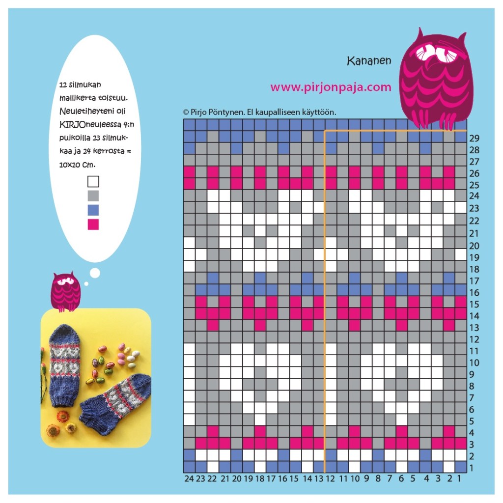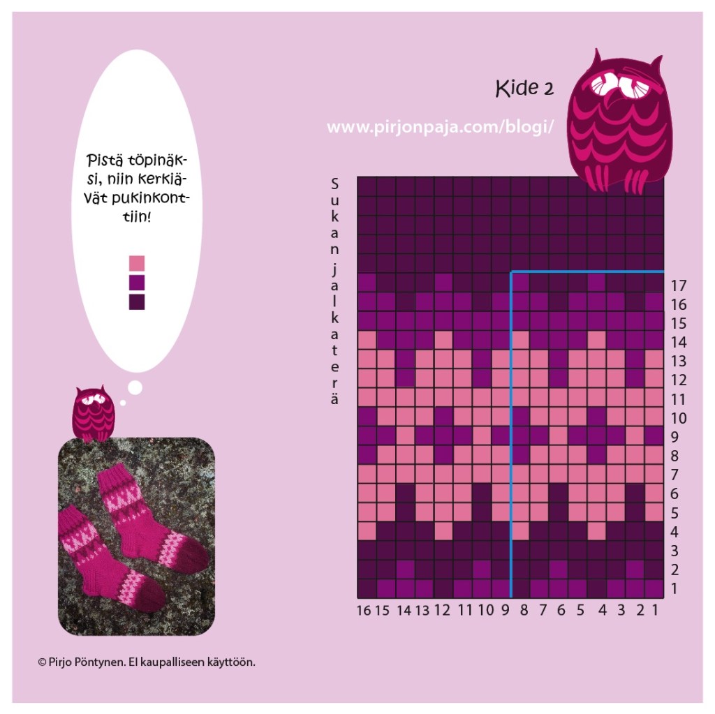 Neulo kantalappu, 24 silmukkaa ja 24 kerrosta. Kantapohjan kavennuksissa on 8 keskisilmukkaa, ja molemmilla sivuilla ne 8 kavennettavaa silmukkaa. Kantalapun reunoilta poimi 13 silmukkaa. Puikoilla on nyt 17, 13, 13 ja 17 silmukkaa=60 silmukkaa.