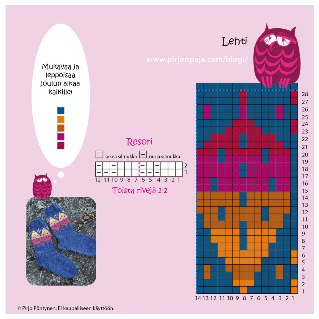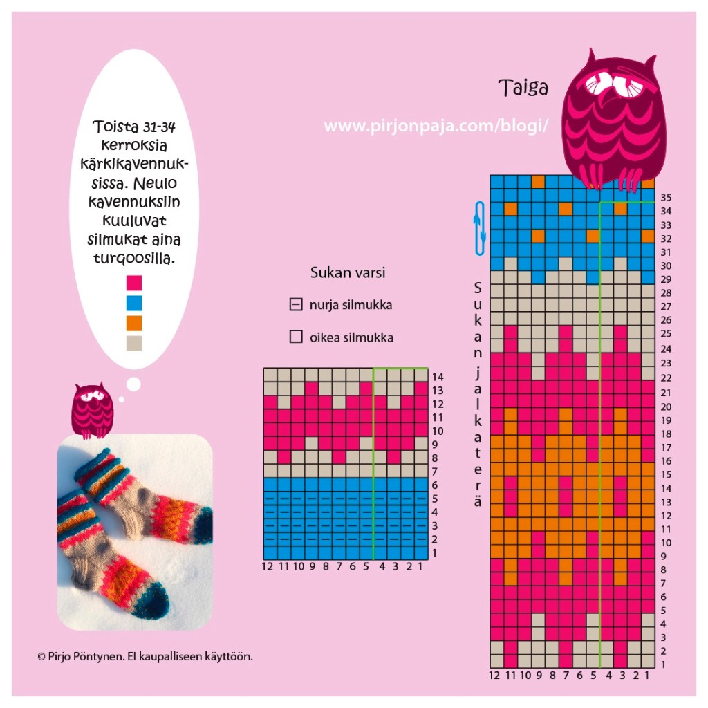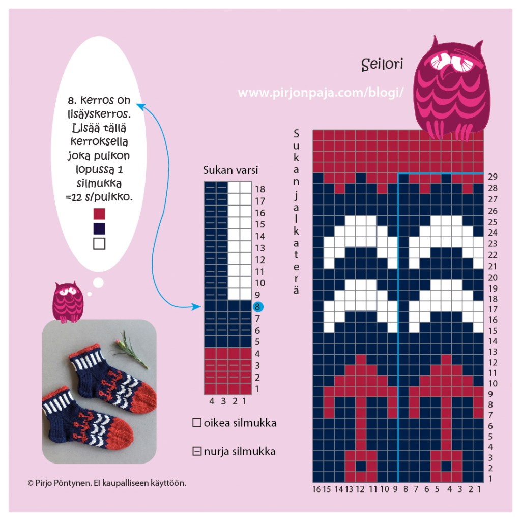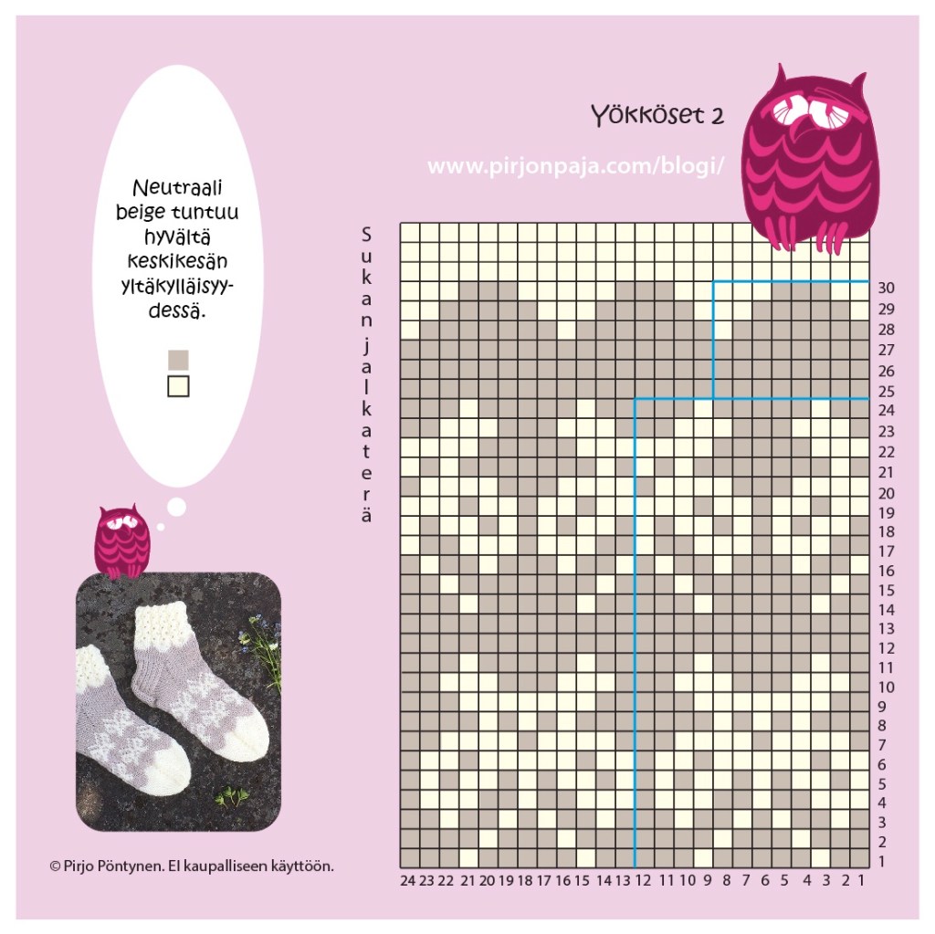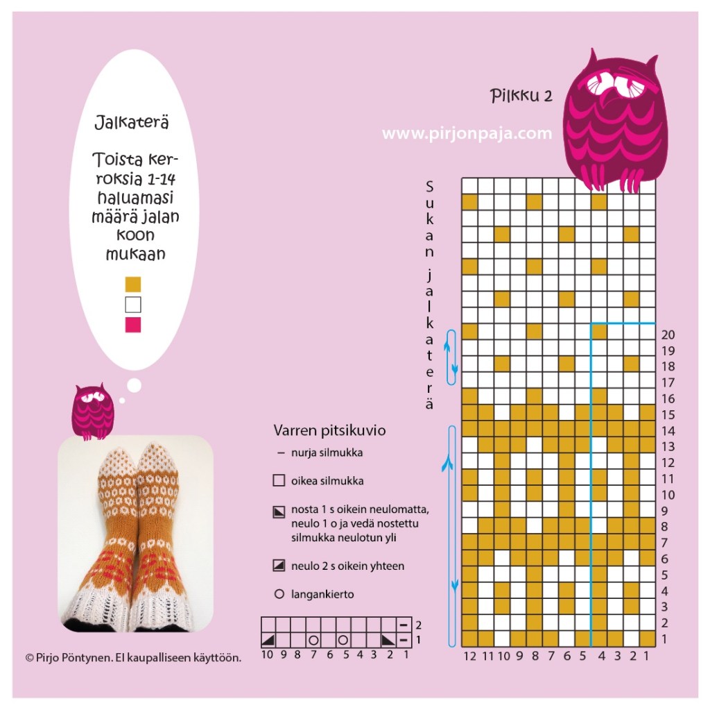 Sukan kokoon ja istuvuuteen vaikuttavat myös kuinka korkea ja leveä jalka on. Voit myös laskea pohjan pituuden eli koon näin: 0,63 x käyttämäsi kengän koko. Esim. 0,63 x 38=23,94=pohjan pituus 24 cm. Kärkikavennusten mitta tässä sukassa on noin 5,5 cm, joten kavennukset tulee aloittaa pohjan ollessa noin 18,5 cm koossa 38. Tällä laskutavalla tulee hieman pienempää sukkaa kuin esimerkiksi Novitan ohjeessa, jossa pohjan pituus on 20 cm koossa 38 ennen kärkikavennuksia.