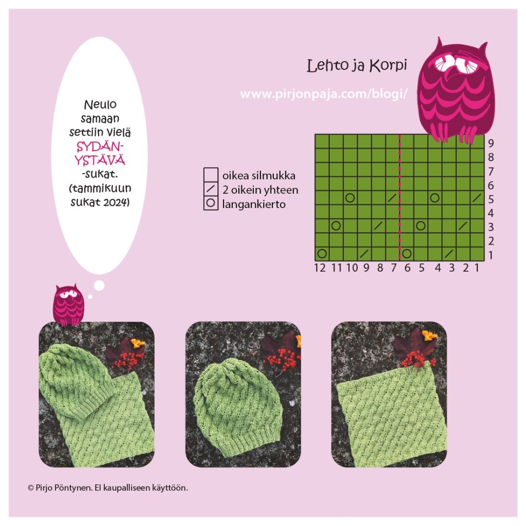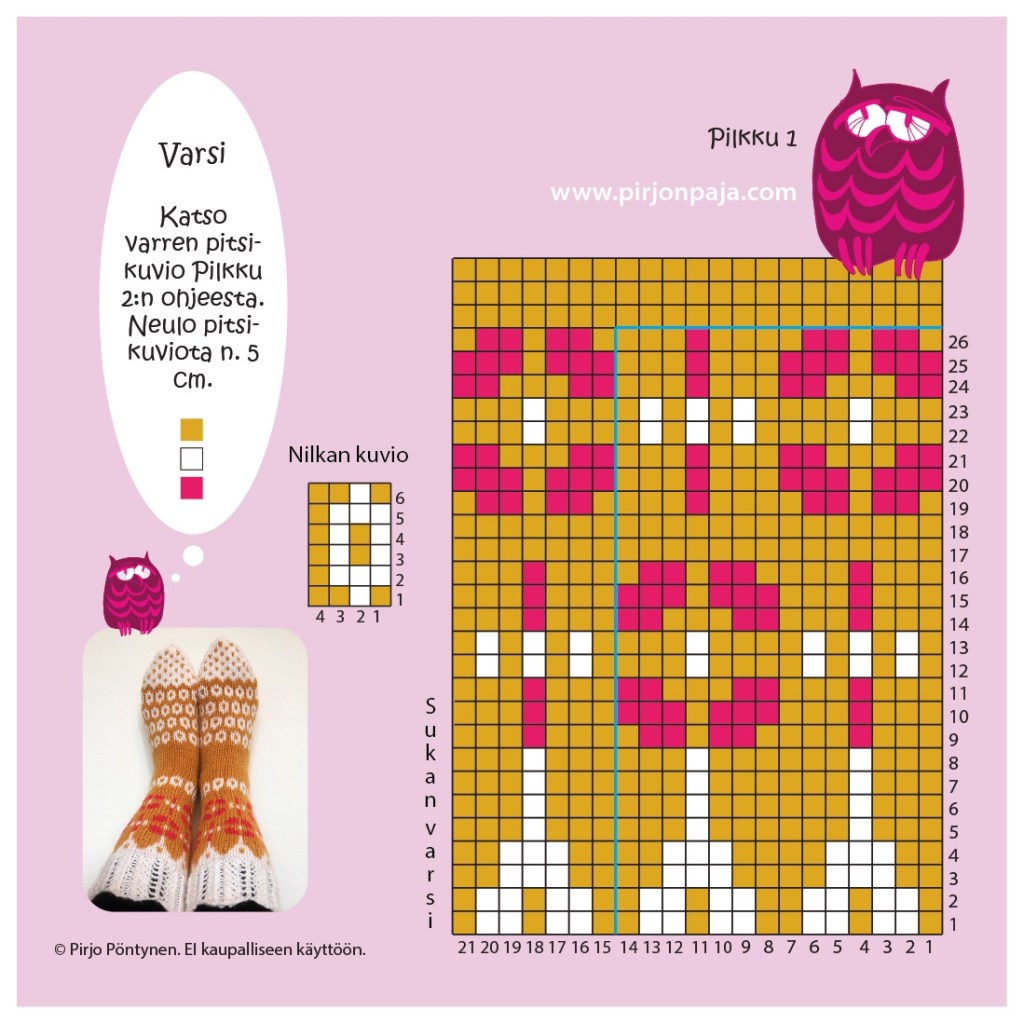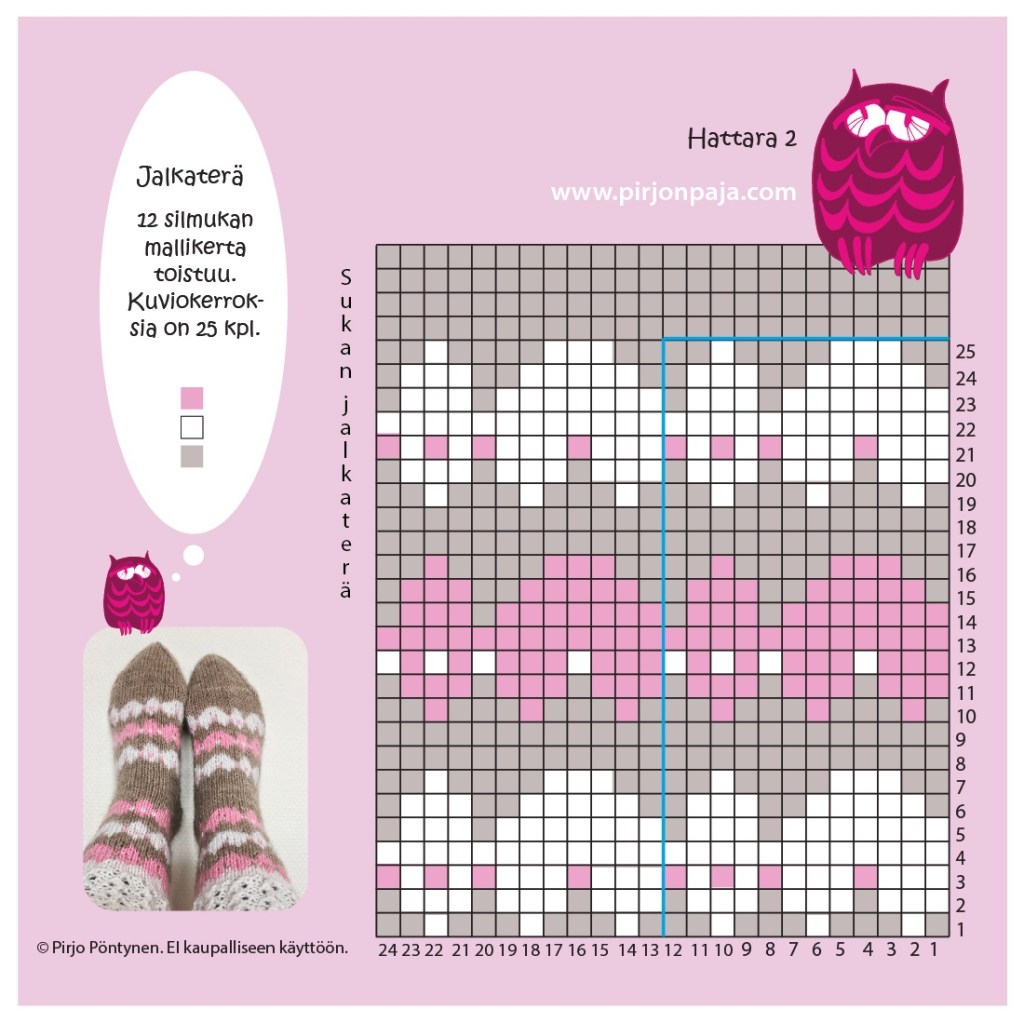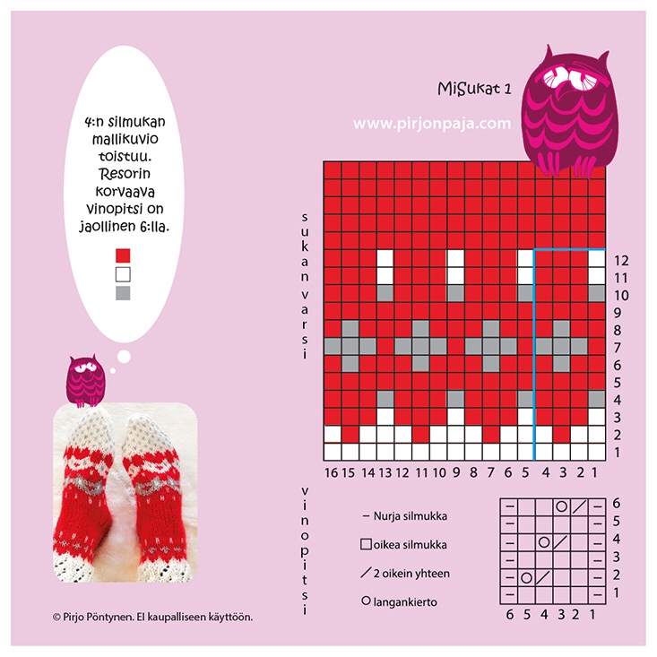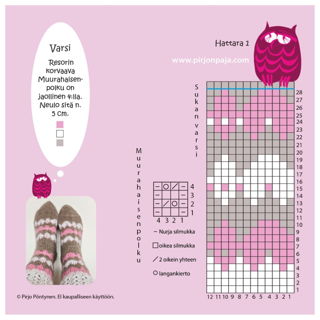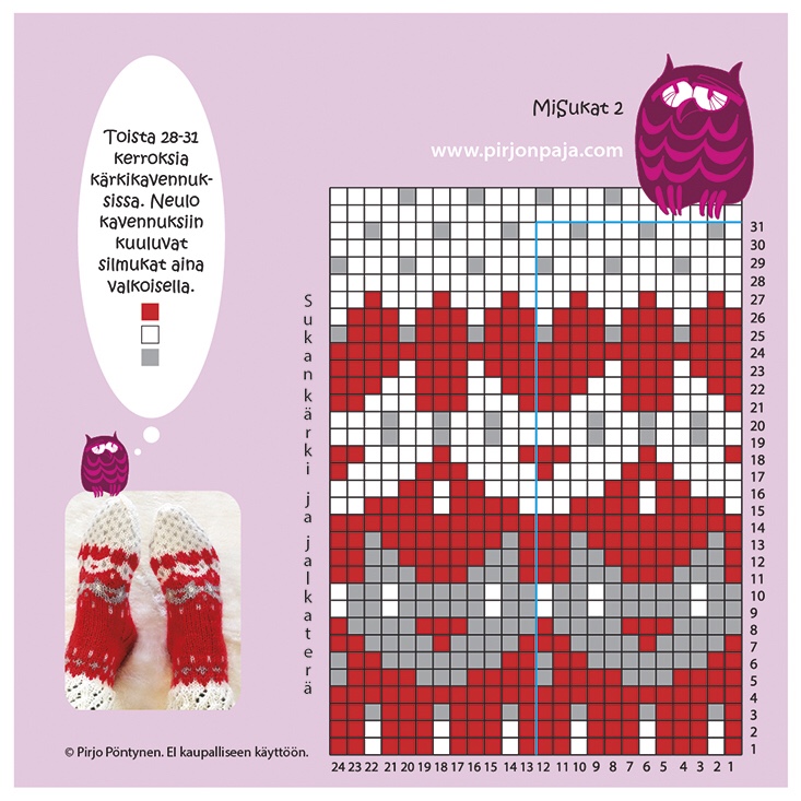 Sukan kokoon ja istuvuuteen vaikuttavat myös kuinka korkea ja leveä jalka on. Voit myös laskea pohjan pituuden eli koon näin: 0,63 x käyttämäsi kengän koko. Esim. 0,63 x 38=23,94=pohjan pituus 24 cm. Kärkikavennusten mitta tässä sukassa on noin 5,5 cm, joten kavennukset tulee aloittaa pohjan ollessa noin 18,5 cm koossa 38. Tällä laskutavalla tulee hieman pienempää sukkaa kuin esimerkiksi Novitan ohjeessa, jossa pohjan pituus on 20 cm koossa 38 ennen kärkikavennuksia.
