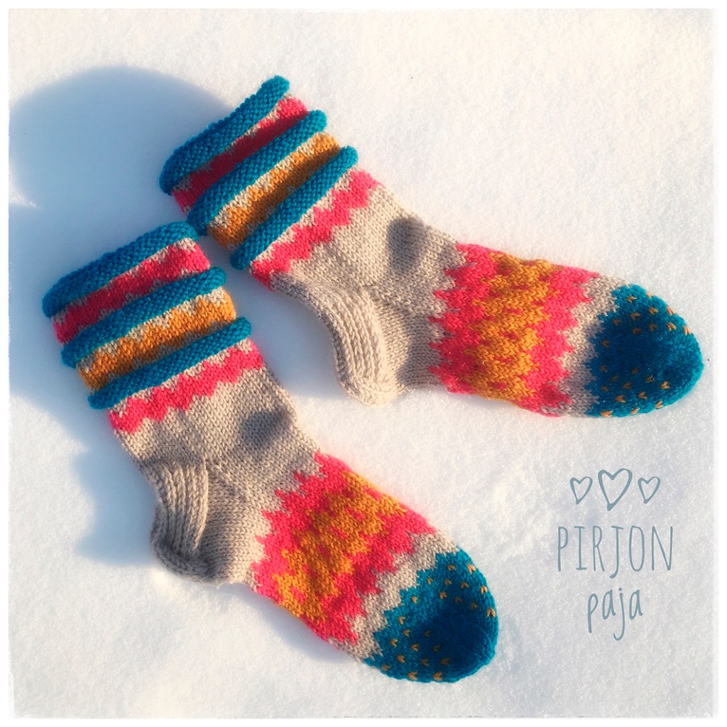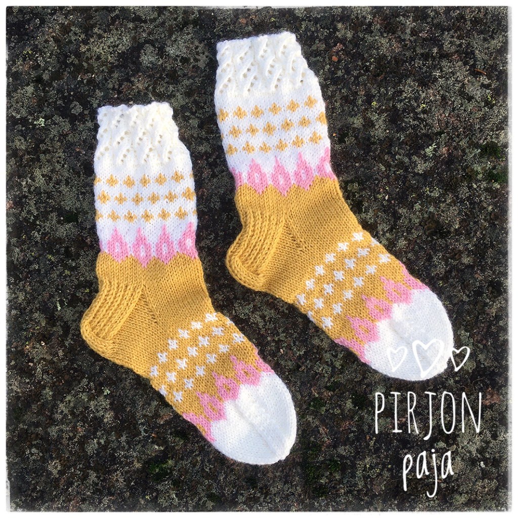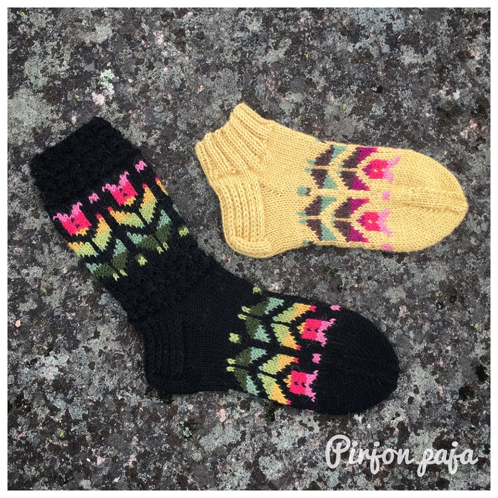 Neuloin sukat Novitan Seiskaveikasta, (musta, valkoinen ja vaaleansininen), ja sinapinkeltaista Novitan Nallea käytin kaksinkertaisena muutamaan kerrokseen.