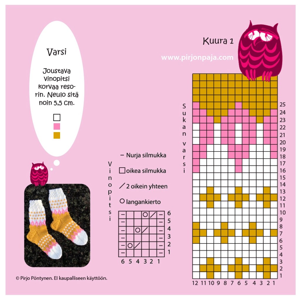 Luo vartta varten keltaisella langalla 3-3,5:n puikoille 48 silmukkaa. (Sironilkkaiset neulokaa resori 3:n puikoilla.) Neulo 2 o 2 n joustinneuletta jakaen samalla silmukat neljälle puikolle, 12 s, 12 s, 12 s ja 12 s/puikko. Yhdistä suljetuksi neuleeksi. Neulo resoria noin 4 cm. Resorin jälkeen neulo yksi välikerros sileää. Seuraavalla välikerroksella lisää 2. ja 3. puikon keskellä yhdet silmukat. Puikoilla on sitten 12, 13, 13 ja 12 silmukkaa. Neulo vielä yksi välikerros sileää ennen kantapäätä.