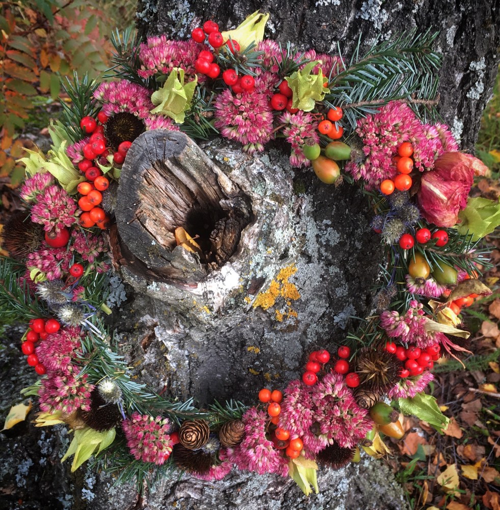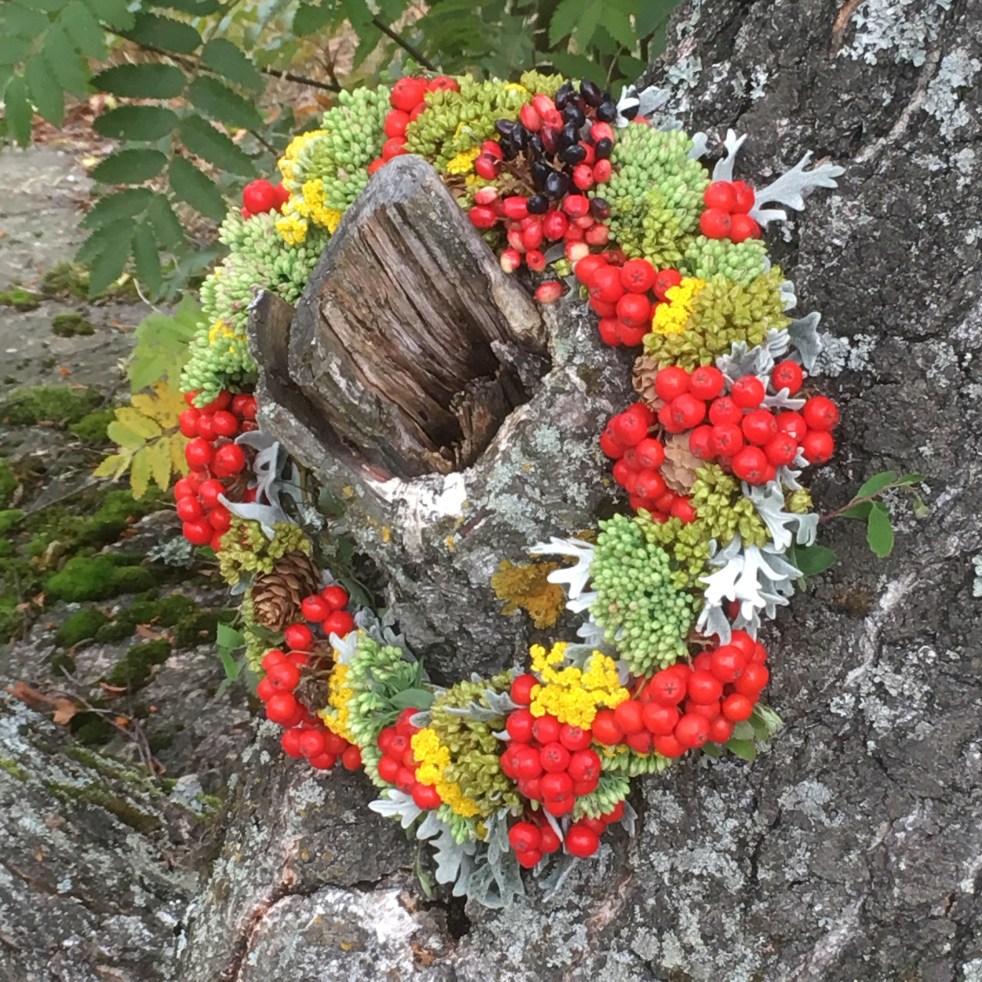 Tähän toiseen seppeleeseen käytin myös lehtikuusen oksia ja jotain toista havukuusen oksaa, jonka löysin pudonneena hautuumaalta. Muita kasveja ovat mm. maksaruoho, pihlajanmarjat, sinipiikkiputki, rudbeckian mykiöt, ruusunmarjat ja malopin siemenkodat.