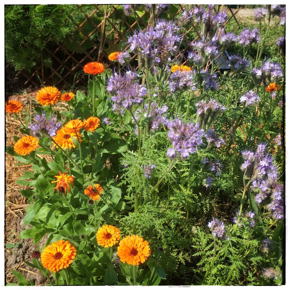 Iloinen yllätys on ollut hunajakukka. Se kukkii runsaasti, ja kerää paljon kimalaisia. Kuvan kehäkukat sen sijaan ovat pettymys, niiden piti olla aprikoosinvärisiä. Nehän ovat aivan tavallisia kehäkukkia. Onkohan pakkaajalla menneet siemenet sekaisin?
