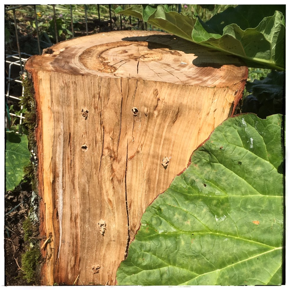 Olen tarkoituksella lisännyt lahopuun osuutta palstalla. Kukkapenkkien reunukset ovat viime talvena pudonneita männynoksia. Tänään teimme hyönteishotellin. Harmi että porakoneesta loppui akku…