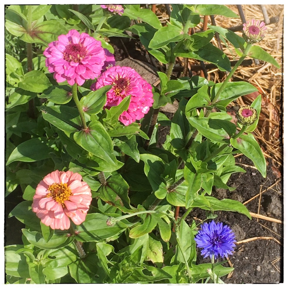 Tänä kesänä minulla oli tarkoitus kasvattaa paljon kukkakimppuihin sopivia kukkia. Tsinnian taimia olikin lupaavasti, mutta alkukesän kuumuus kyllä näännytti ne. Vain harvat selvisivät paahteesta. Sen sijaan odottelen nyt sini-ikiviuhkoja, kosmoskukkaa ja espanjanneitoja, ne tuntuvat selviytyvän.