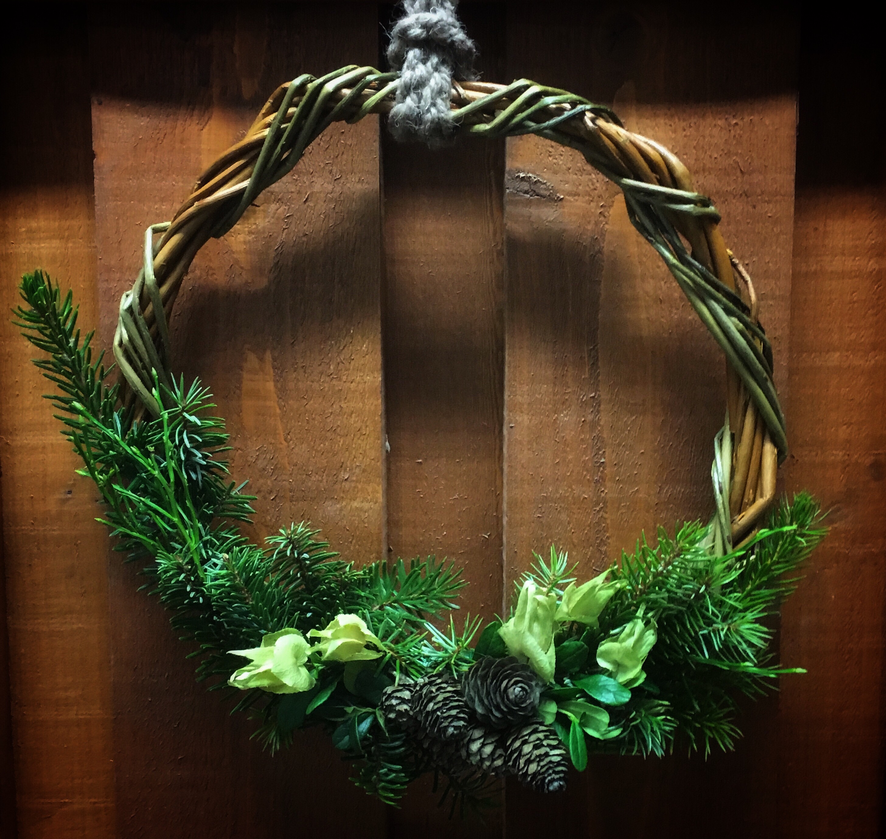 Tähän pajukranssiin käytin mäntyä, kääpiökatajaa ja marjakuusta.