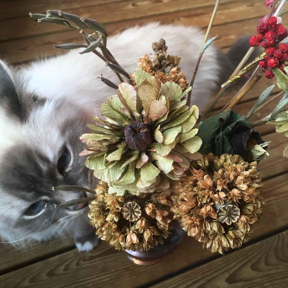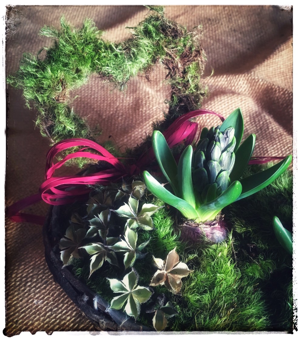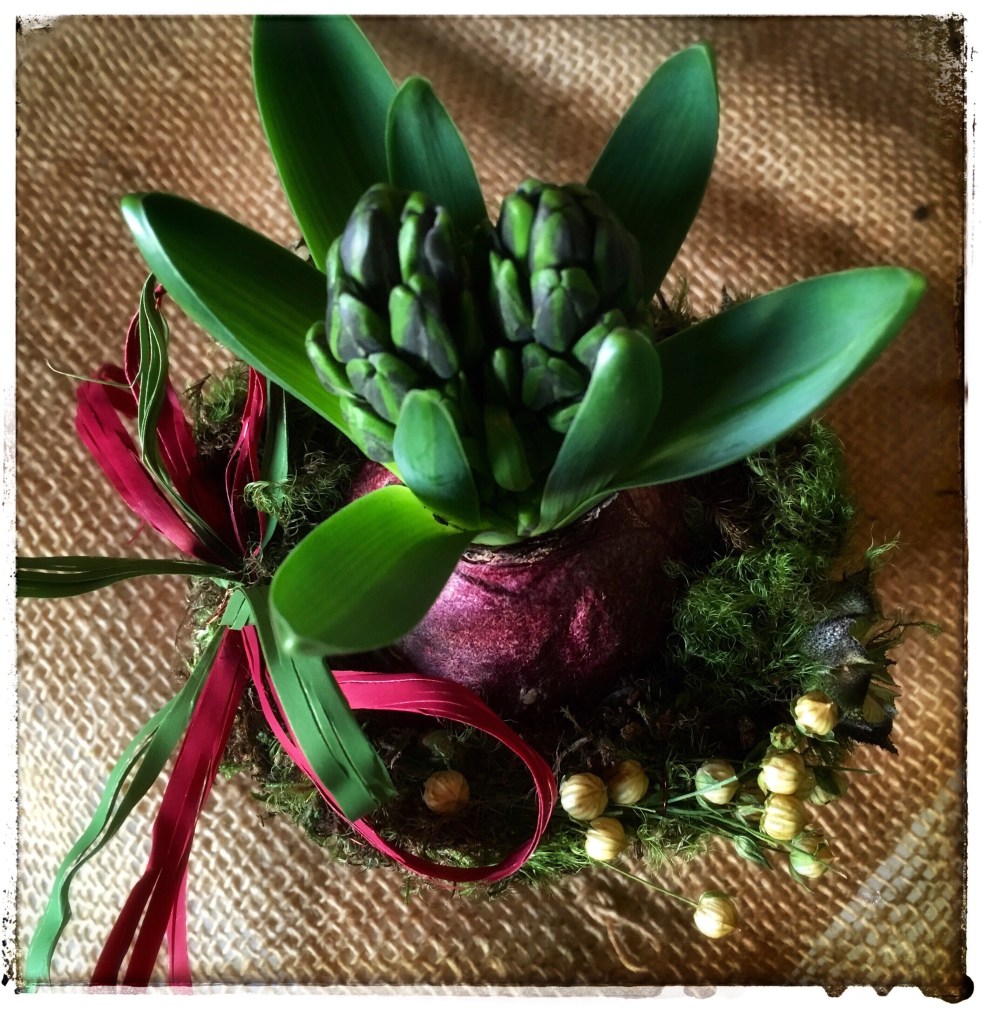 Tämän pienen hyasintin juurella on minikranssi, jossa käytin sammalta, pellavaa ja Mooseksen Palavan Pensaan siemenkotia.