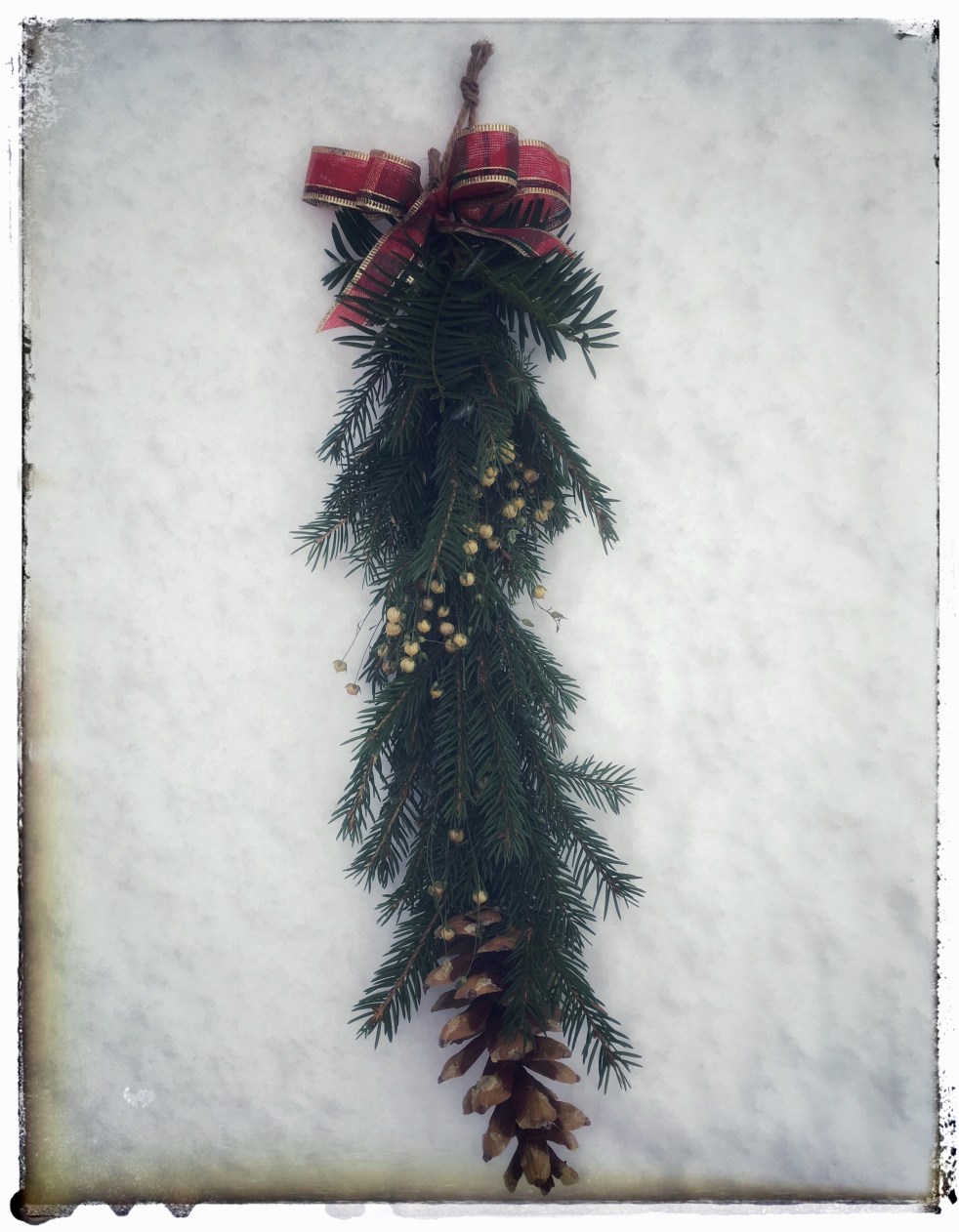 Kokeilin myös tällaista pitkää ovikoristetta. Rusetissa näköjään rohkeasti kultaa, ha haa!