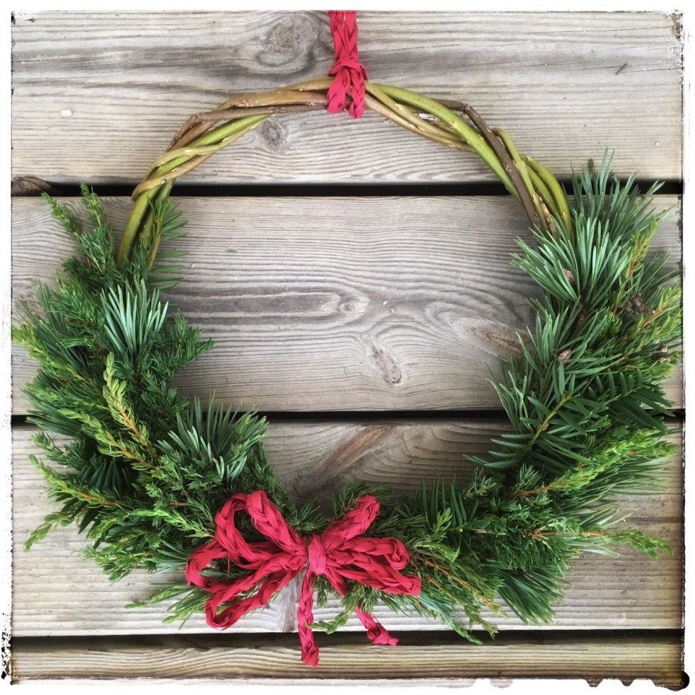 Tähän pajukranssiin käytin mäntyä, kääpiökatajaa ja marjakuusta.